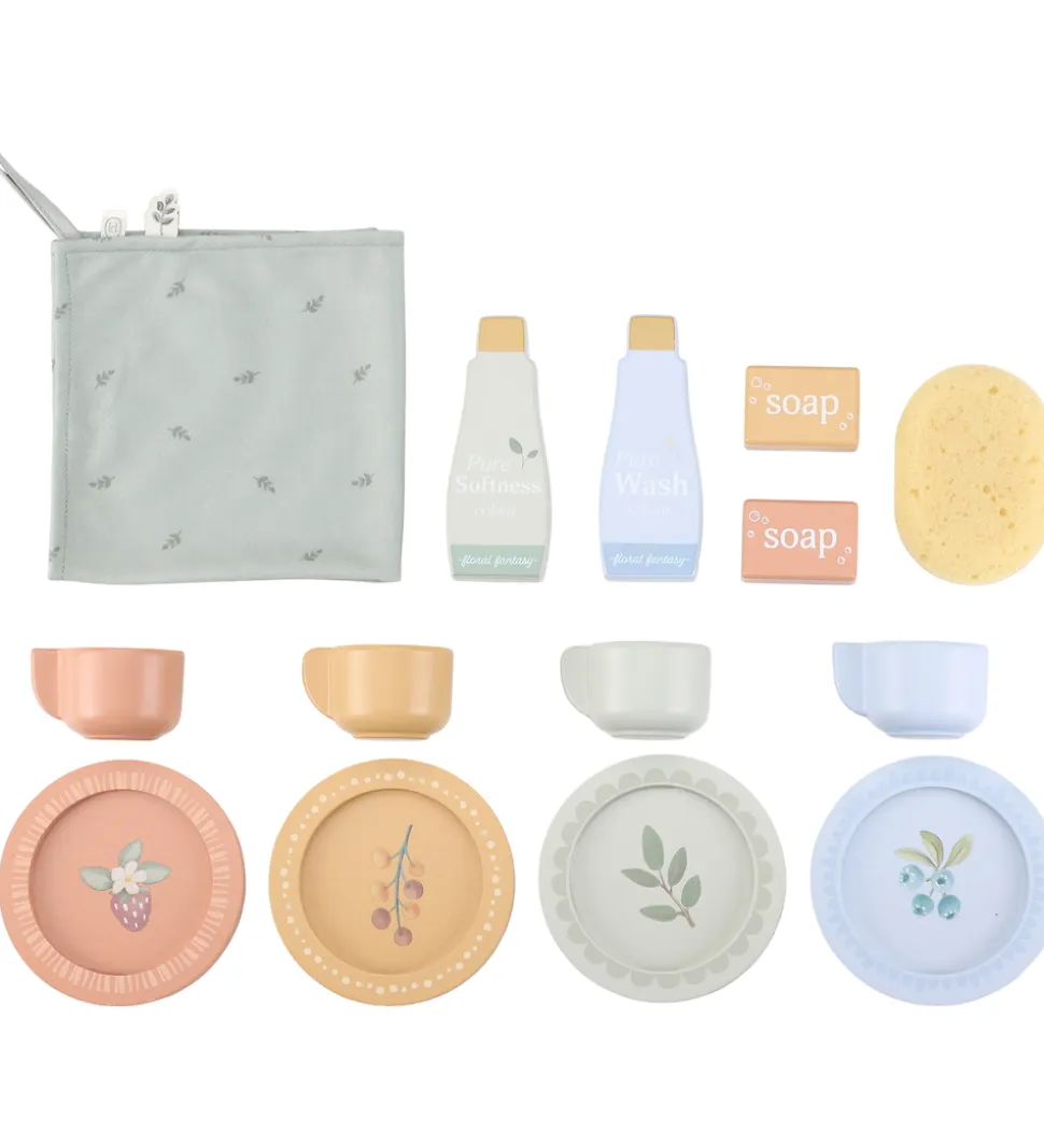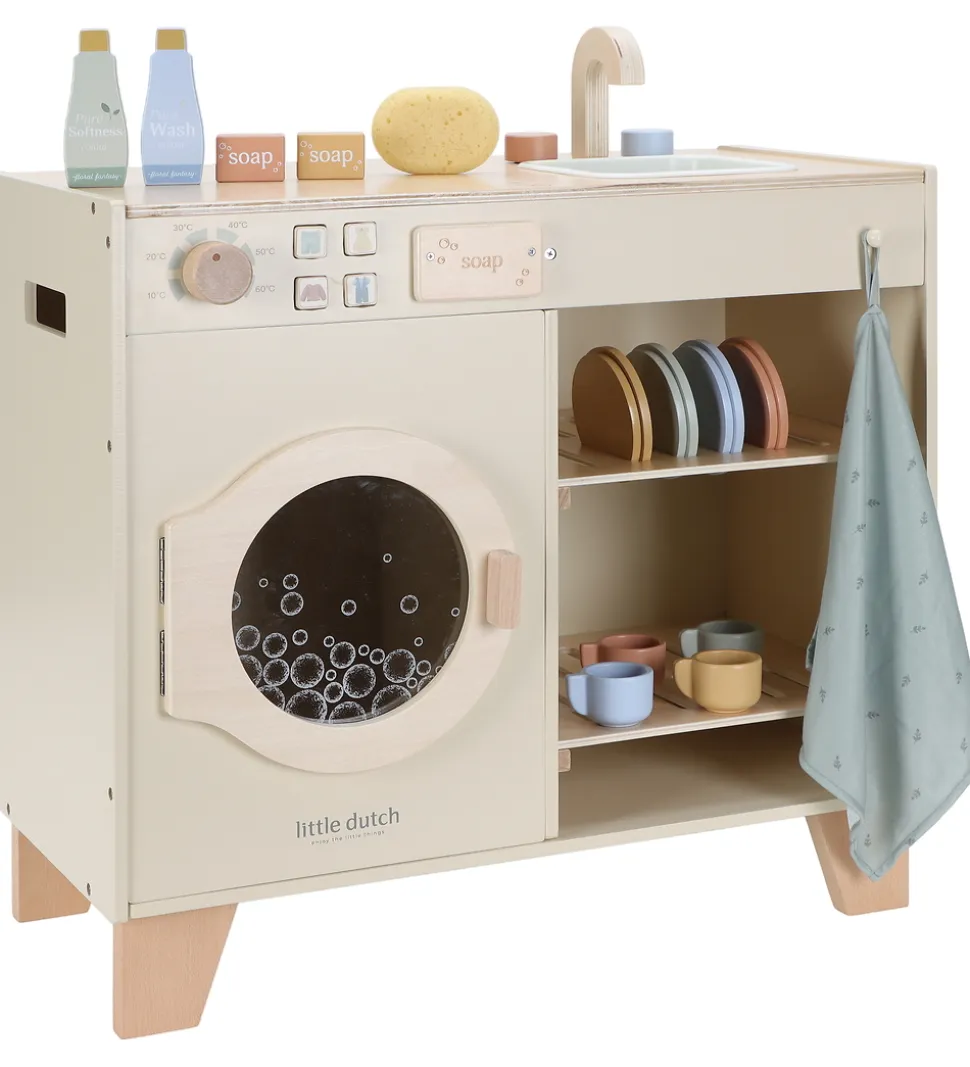 Legemøblet har alt, hvad man skal bruge for at vaske tøj og opvask. Det inkluderer forskelligt tilbehør: fire kopper, fire underkopper, to tallerkener, vaskemiddel, sæbeblokke og et viskestykke. Opvaskemaskinen har realistiske knapper med illustrationer samt et rum til sæbeblokken, hvilket gør legen endnu mere realistisk og sjov.