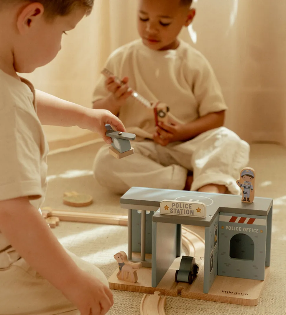 Charmerende Little Dutch politistation i blå. Politistationen inkluderer en politibil, helikopter og figurer, der skaber en spændende legeoplevelse. Little Dutch fokuserer på detaljer og kvalitet.