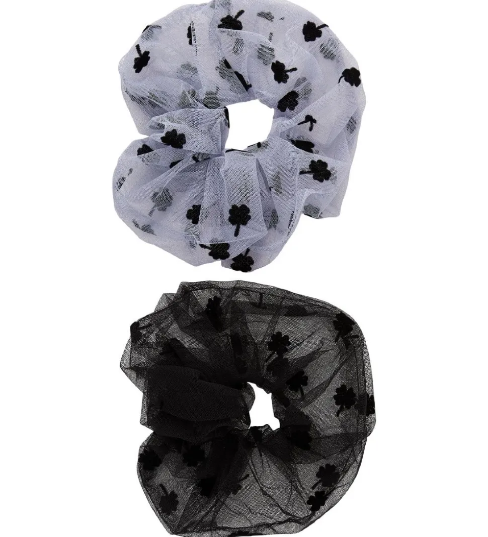 Flotte Little Pieces scrunchier solgt i en praktisk 2-pak, én i grå med et lyselilla skær og en i sort, begge med små blomster i sort.