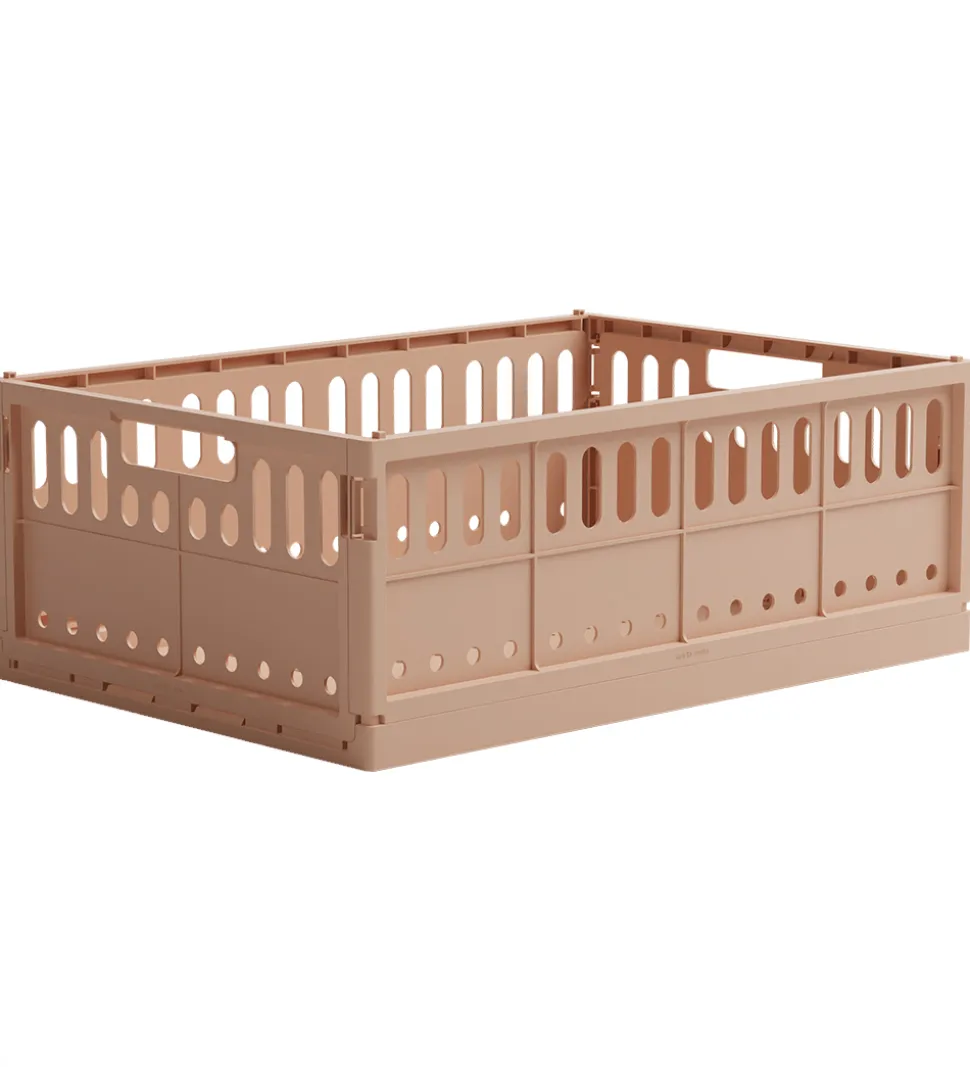 Made Crate foldekassen samles ved at klikke alle hjørnerne sammen, og den foldes nemt sammen igen. Foldekassen kan bruges til opbevaring af f.eks. kreating, tøj, nips, legetøj, plejeprodukter og eller noget helt andet. I begge ender er der praktiske håndtag, og foldekassen kan stables med flere af samme størrelse.