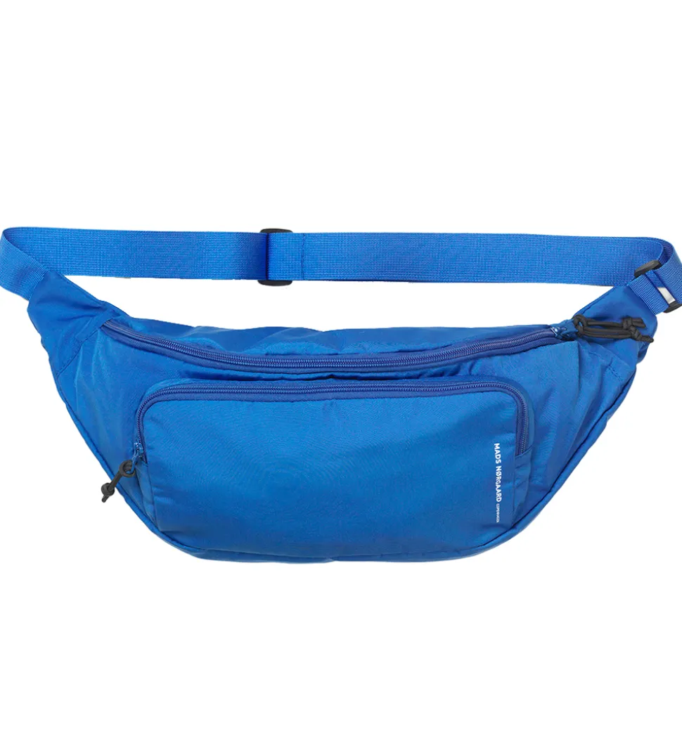 Skøn Mads Nørgaard bæltetaske i en klar blå farve med et lille, hvidt logo på fronten.