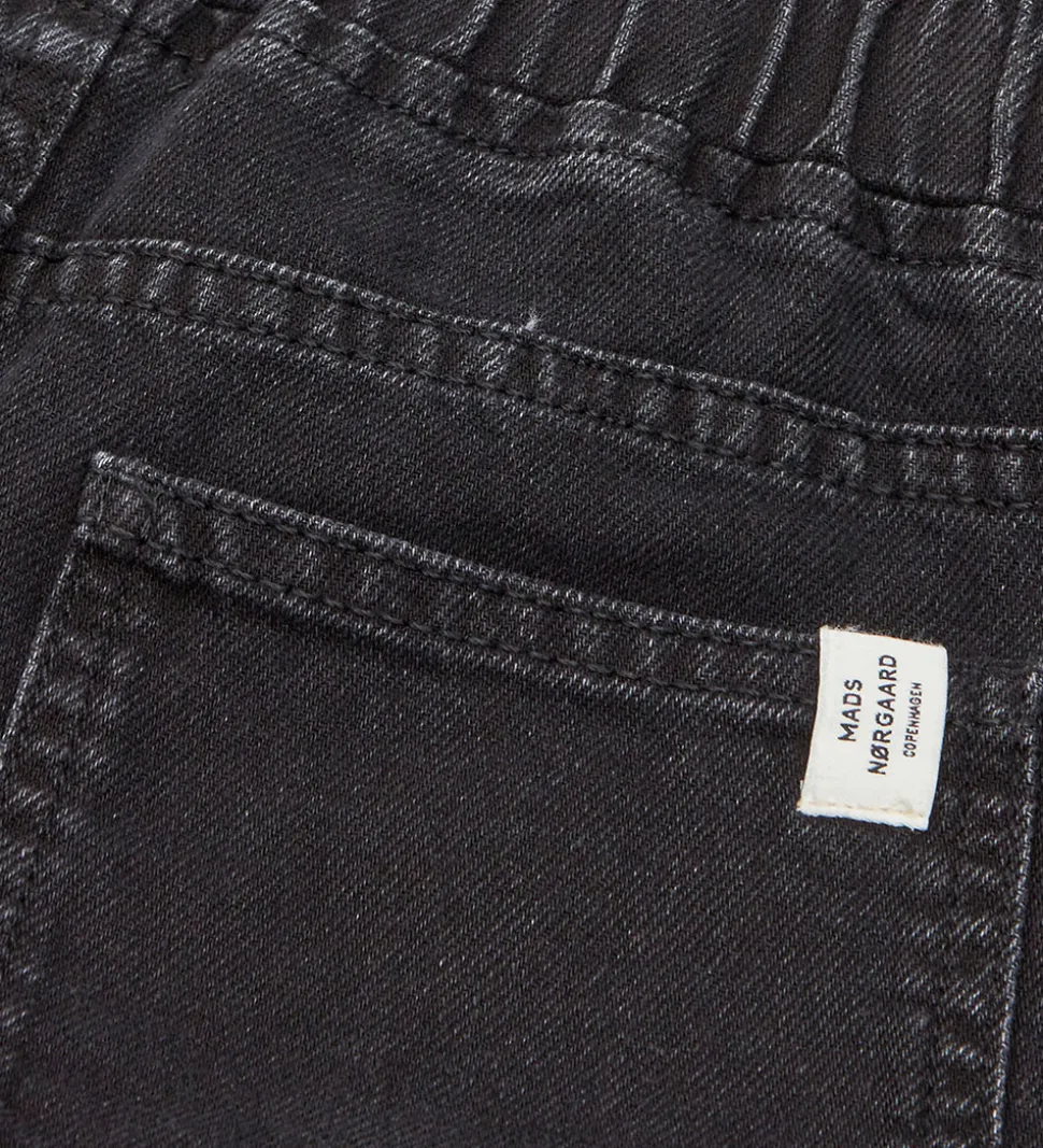 Stilfulde Mads Nørgaard jeans i sort denim med let vasket look. Mads Nørgaard jeansene har en elastisk talje og to praktiske lommer foran. Bagpå er der to lommer. Jeansene har en afslappet pasform med brede ben, som strammes lidt ind ved anklerne.