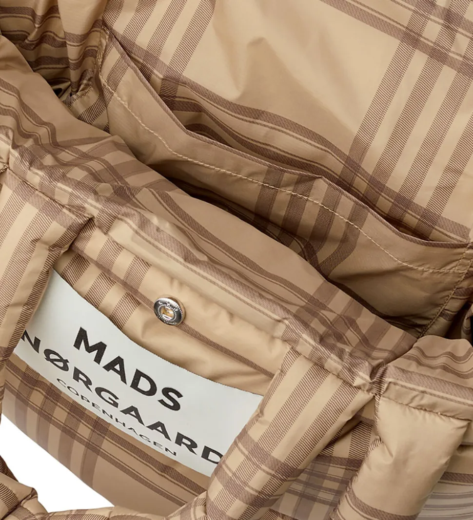 Smart Mads Nørgaard shopper i brune og mørkebeige nuancer med ternet mønster og en hvid patch på forsiden med “Mads Nørgaard Copenhagen” i sort.