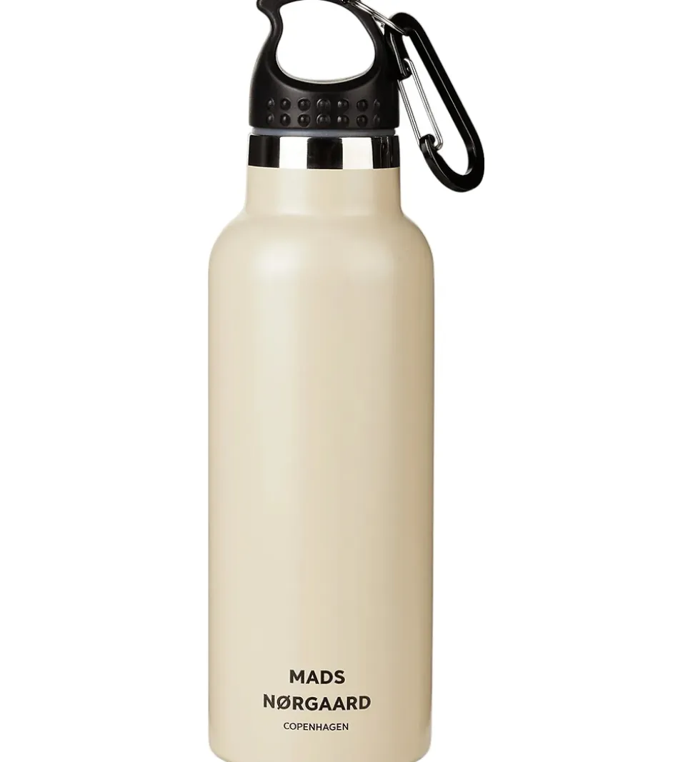 Praktisk Mads Nørgaard termoflaske i beige med et sort logoptint på fronten.