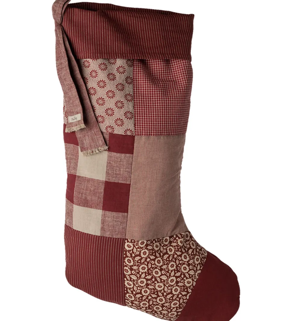 Elegant Maileg julesok i en varm, rød nuance og mørkebeige med et charmerende patchworkmønster.