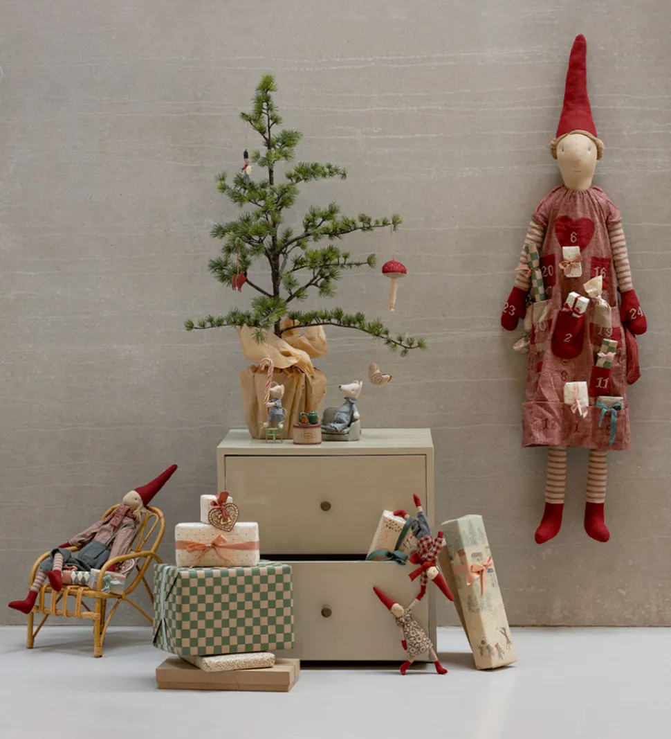 Charmerende Maileg nissedreng med en stribet skjorte i rød og beige, grå bukser med seler samt en rød nissehue og matchende vanter. Nissedrengen skaber et klassisk og hyggeligt udtryk til jul.