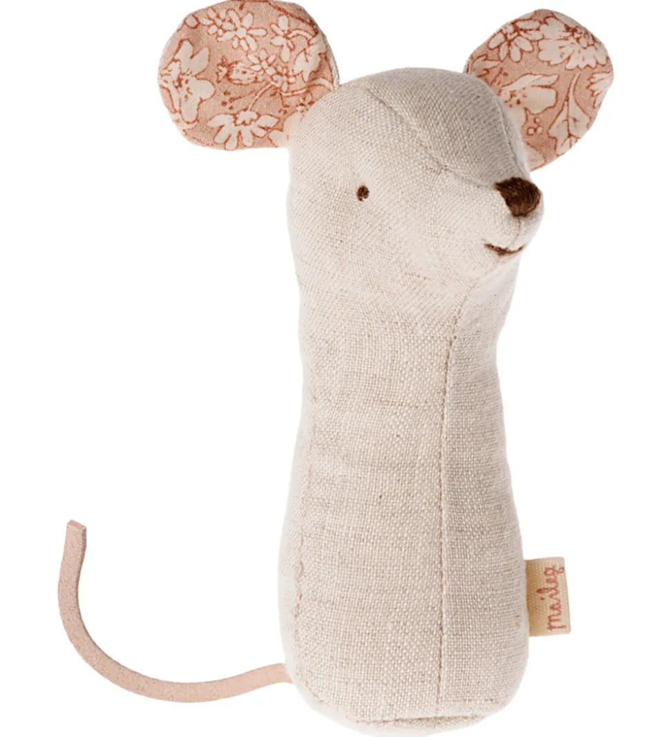 Sød Maileg rangle formet som en beige mus med et sødt blomsterprint på indersiden af ørene.