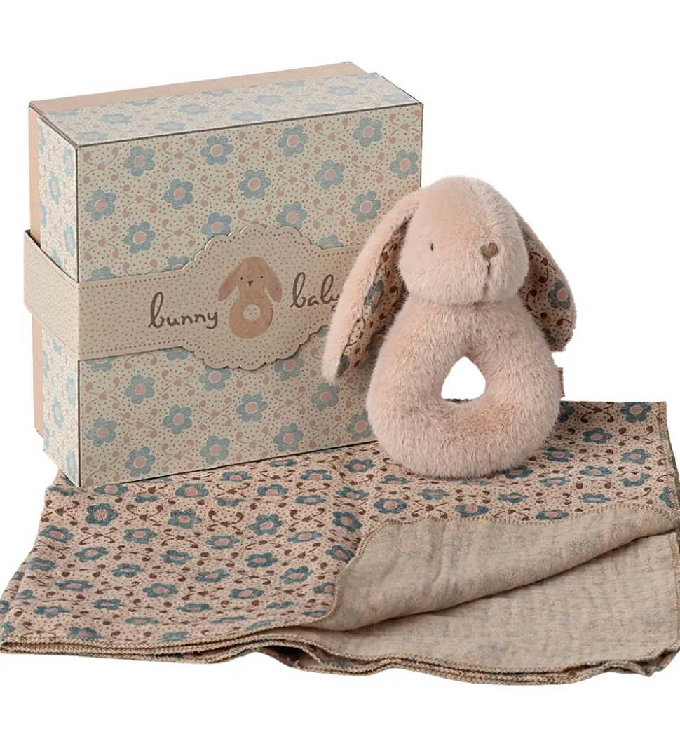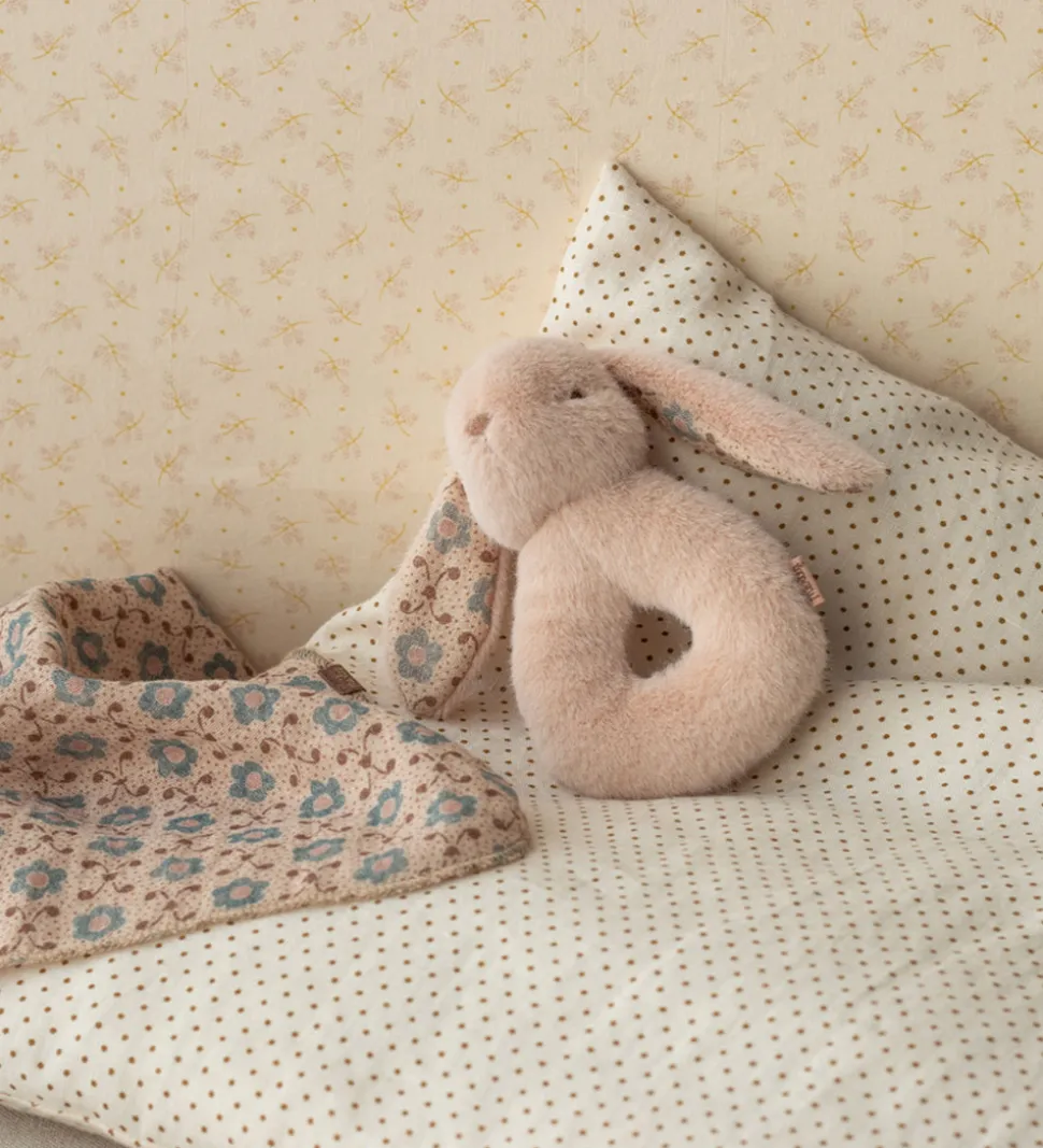 Fin Maileg ranglesæt bestående af en blød stofble i beige musselin med et blomsterprint i rosa og blå. Ranglen har form som en sød kanin og har en behagelig raslelyd, hvilket gør den både charmerende og sjov for de mindste. Maileg ranglesættet er den perfekte gaveide.