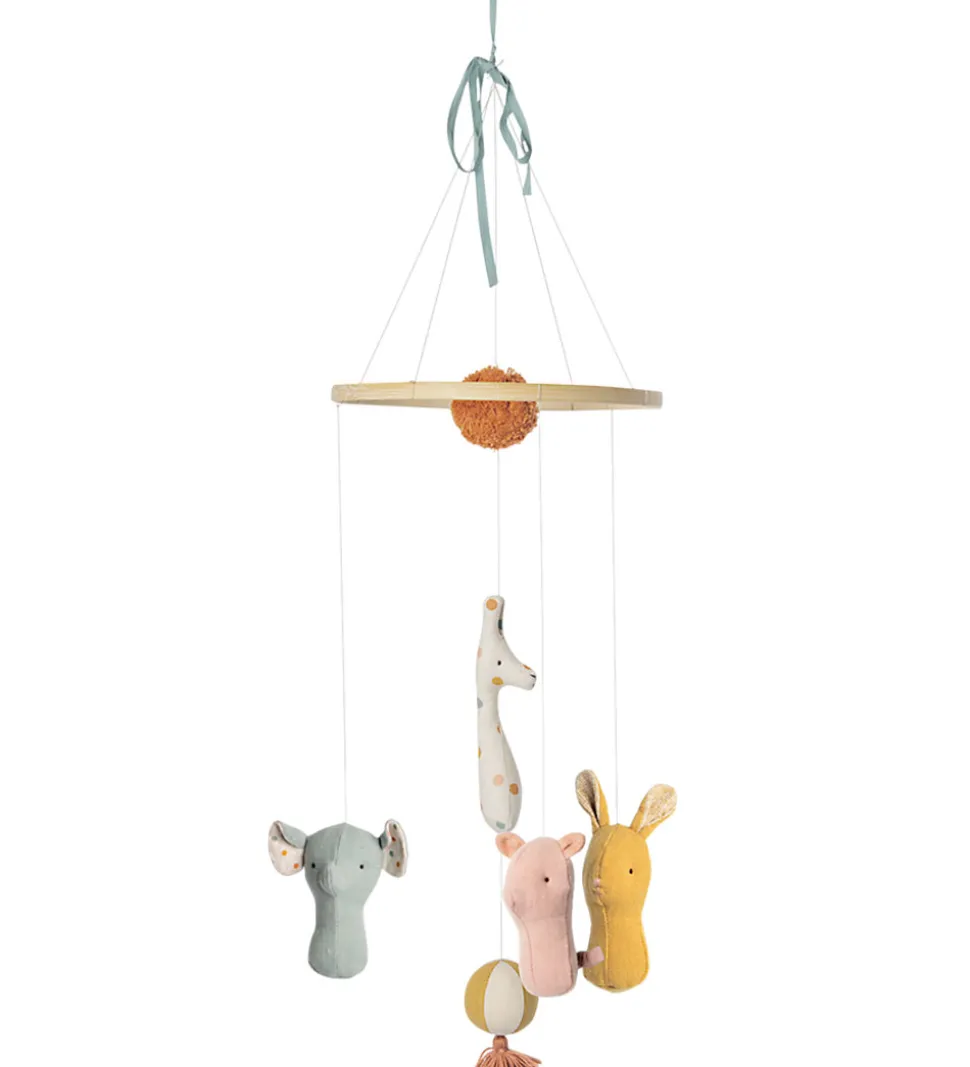 Fin Maileg uro med søde vedhæng i form af bamser; en kanin, en gris, en elefant og en giraf samt en stibet bold med kvast og en pompon.