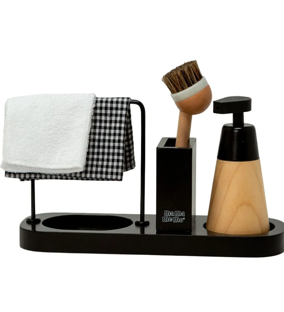 Sødt MaMaMeMo opvaskesæt i sort og træ. Opvaskesættet består af følgende:
