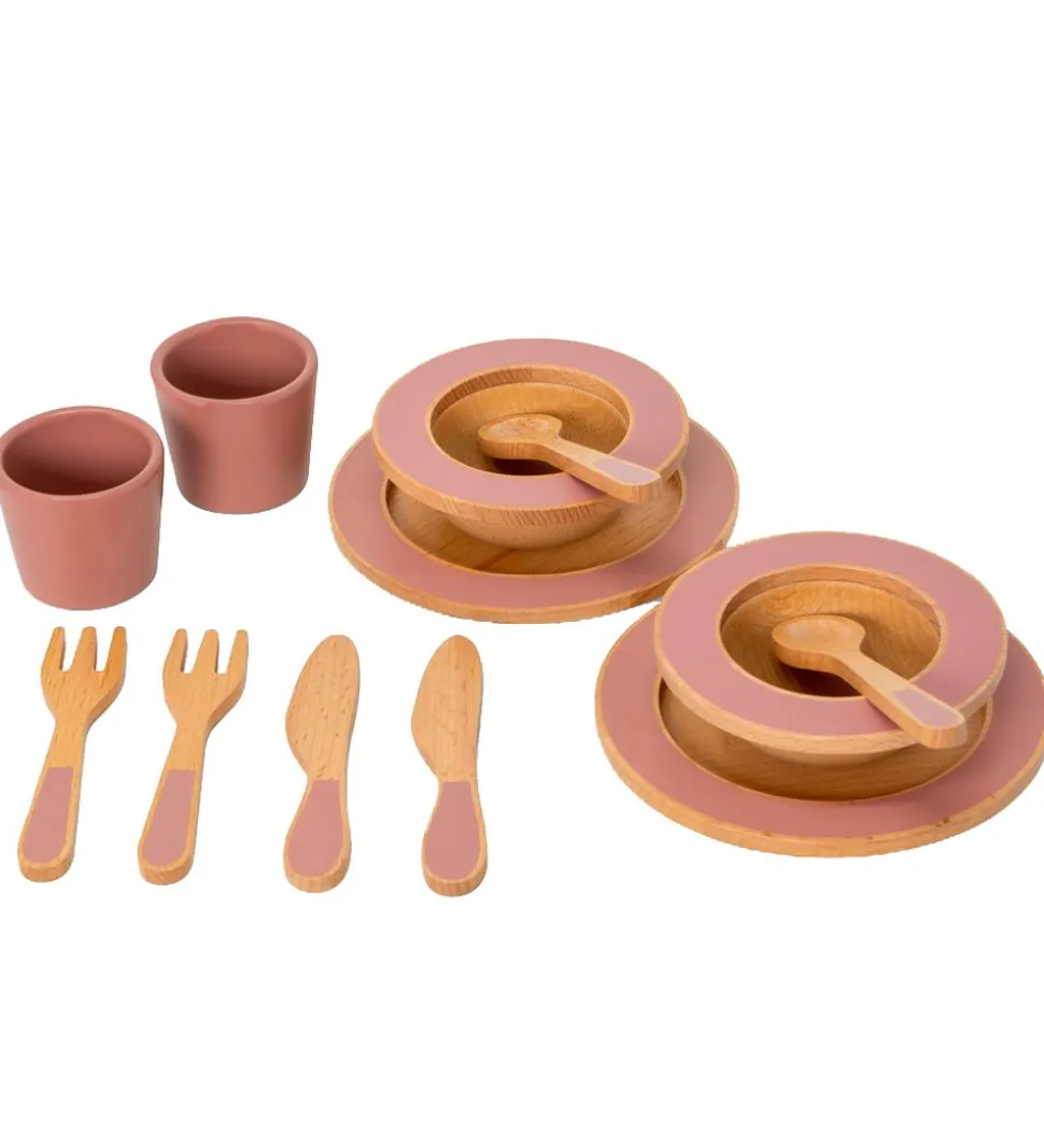 Skønt MaMaMeMo spisestel i støvet rosa og træ. Stellet består af følgende: