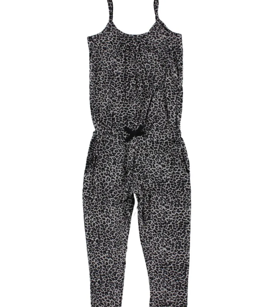 Buksedragten er i et gråt leopardprint. Toppen af buksedragten er en stroptop som er let rynket fortil. Ved taljen er der elastik og på midten er der en sød sort sløjfe.