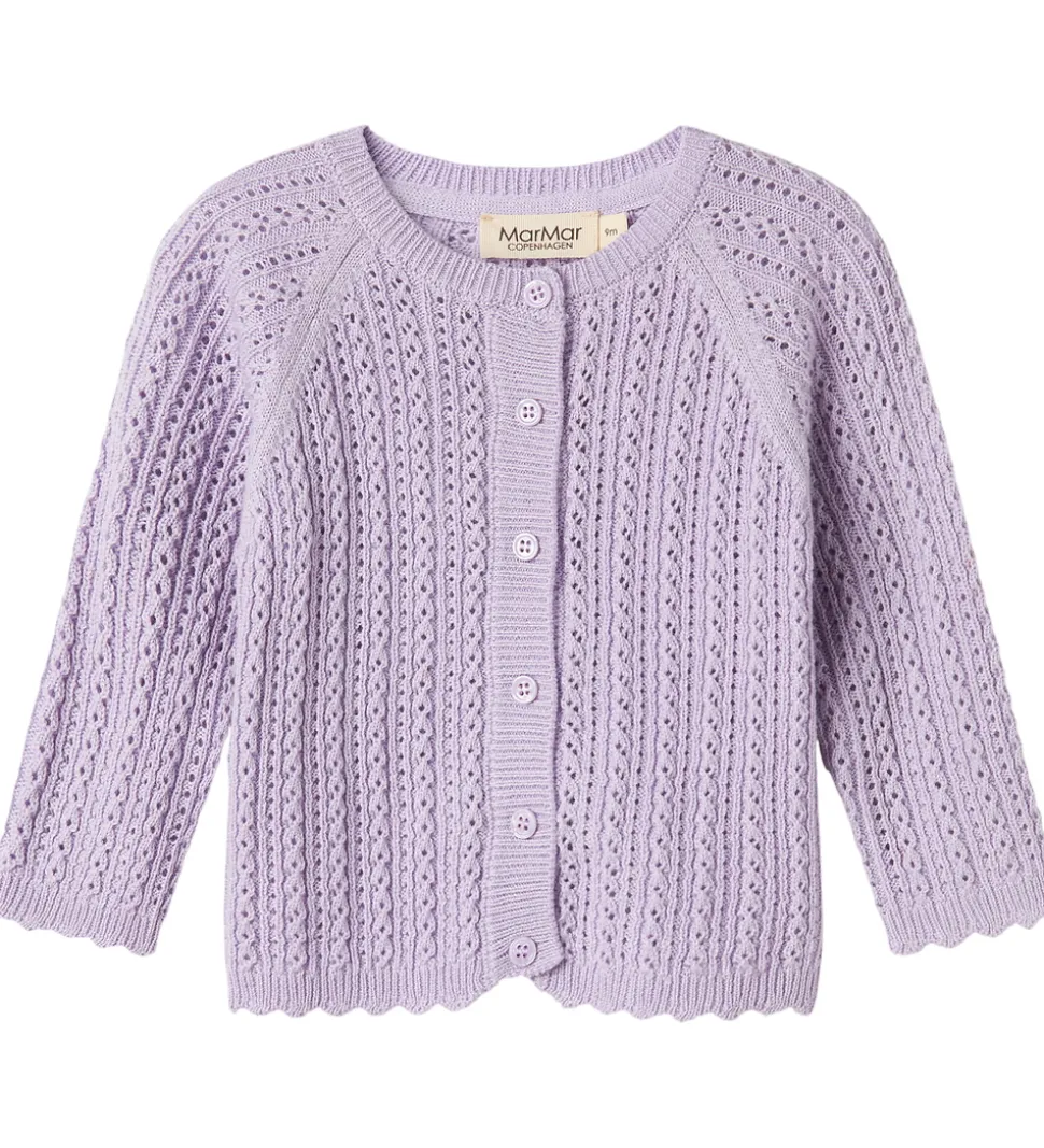 Smuk MarMar cardigan i en lys lilla farve med raffineret hulmønster. Denne MarMar cardigan har en rund halsudskæring og lange ærmer med raglan-snit, der sikrer en god pasform. Cardiganen har en gennemgående knaplukning foran og ribkanter i hals og ved ærmer for et stilrent udtryk.