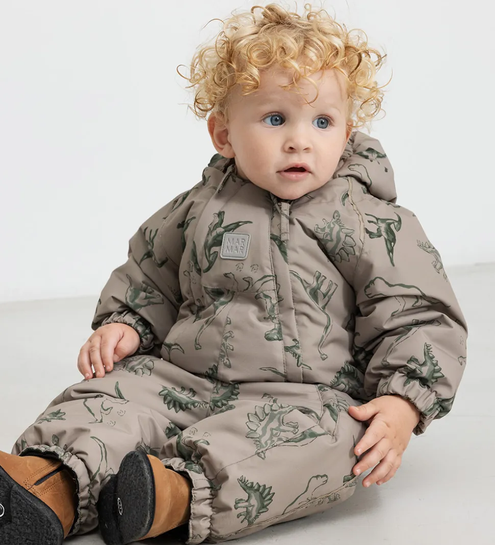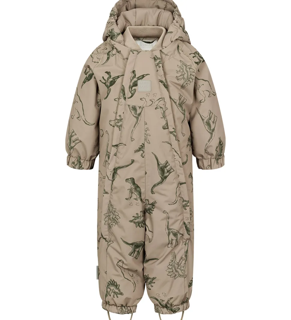 Smart MarMar flyverdragt i lysegrøn med et alloverprint af dinosaurer i grønne nuancer. Flyverdragten har praktiske refleksdetaljer.