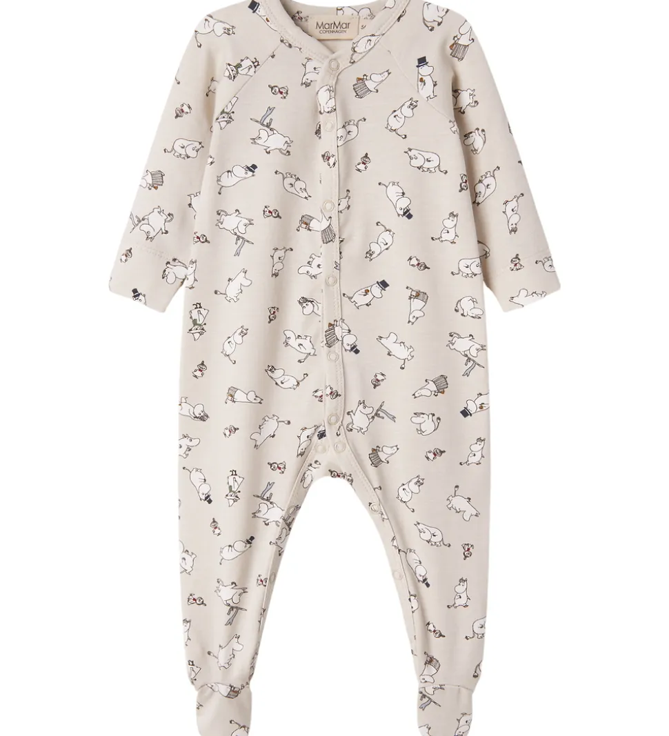 Elegant MarMar heldragt i en lys, beige nuance med et charmerende print af Moomins-figurer.