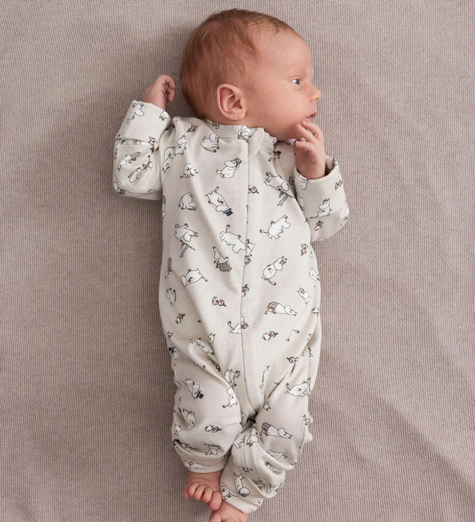 Elegant MarMar heldragt i lysebeige med et charmerende print af små Moomins-figurer. MarMar heldragten har lange ærmer og ben, hvilket giver en behagelig pasform. Den åbnes praktisk foran med lynlås, som fortsætter mellem benene for let adgang.