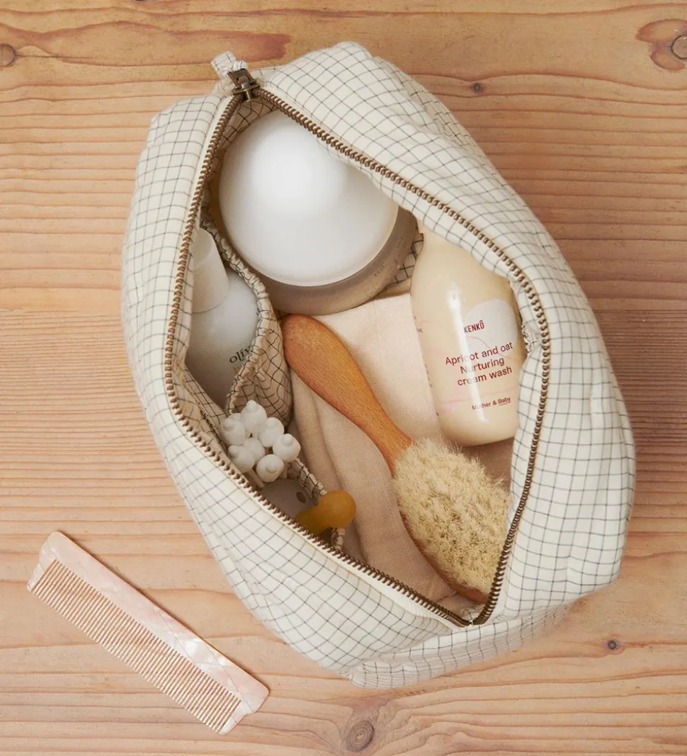 Flot MarMar toilettaske i hvide med et ternet mønster i navy, og den er blødt vatteret.