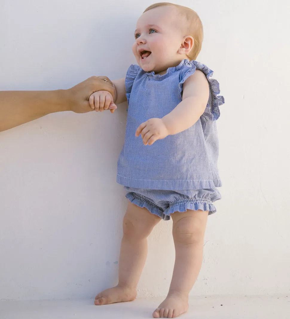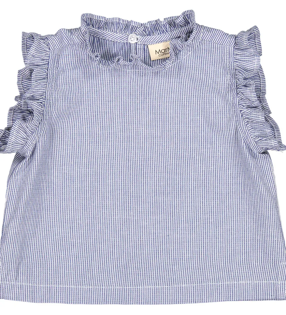 Flot MarMar top i en fin stribet blå og hvid farve. Toppen har søde flæsedetaljer ved skuldrene samt kraven, der giver et elegant udtryk. MarMar toppen lukkes med knap i nakken.
