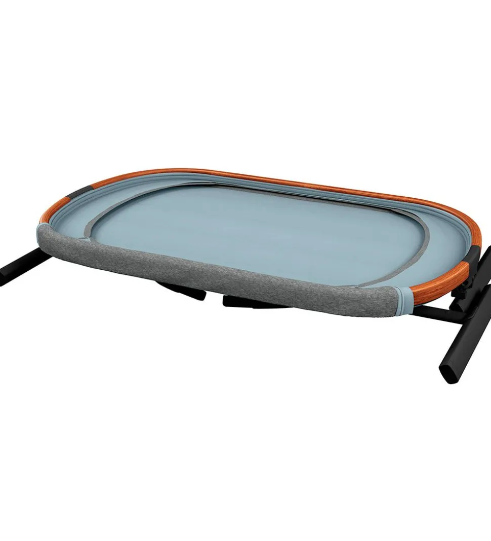 Lækker Maxi-Cosi babyseng i gråt tekstil og med et grålakeret metalstel samt mørkt træ.