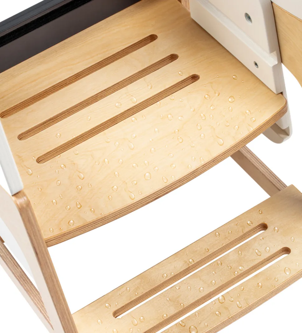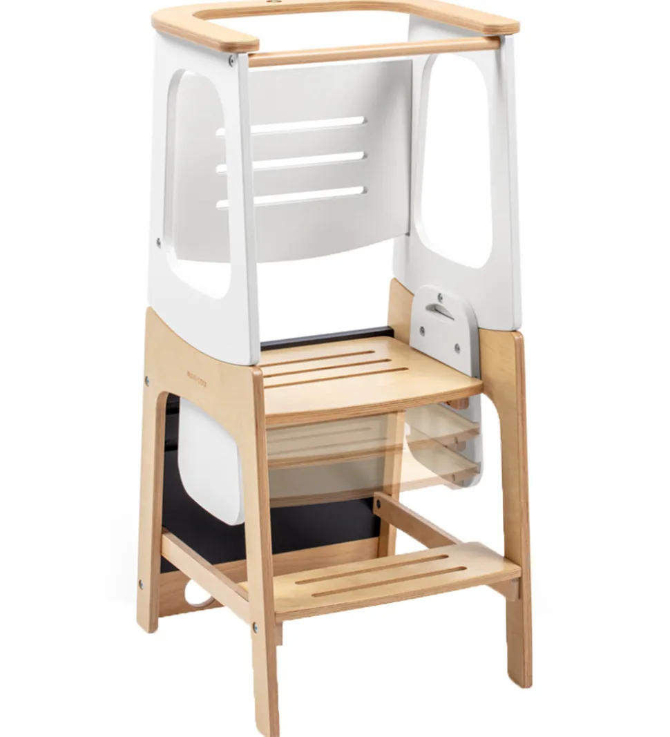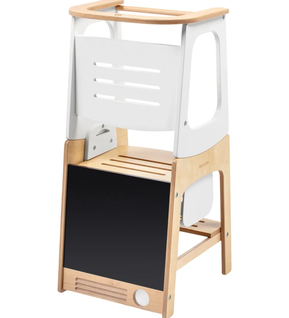 Flot Maxi-Cosi læringstårn i naturfarvet og hvidlakeret træ og med en sort tavle.