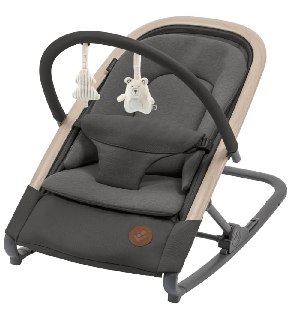 Lækker Maxi-Cosi skråstol i mørkegråt tekstil og med et stel af lyst træ og grålakeret metal.