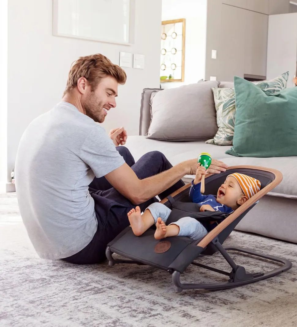 Med et enkelt greb kan man skifte mellem 3 positioner med forskellig hældning, og man kan vælge, om skråstolen skal vippe, eller om den skal være stillestående. Der medfølger en bue med aktivitetslegetøj med forskellige strukturer.
