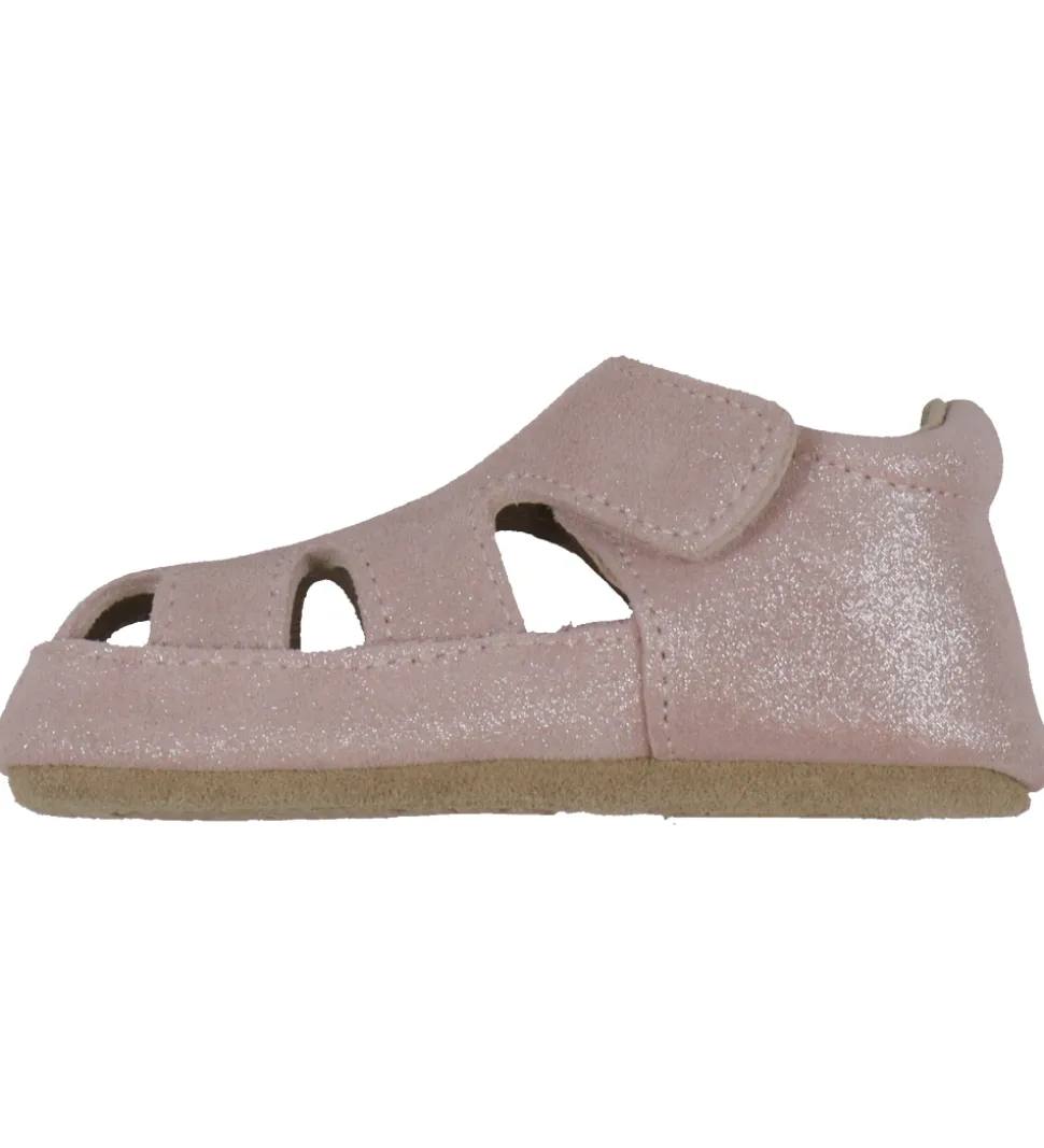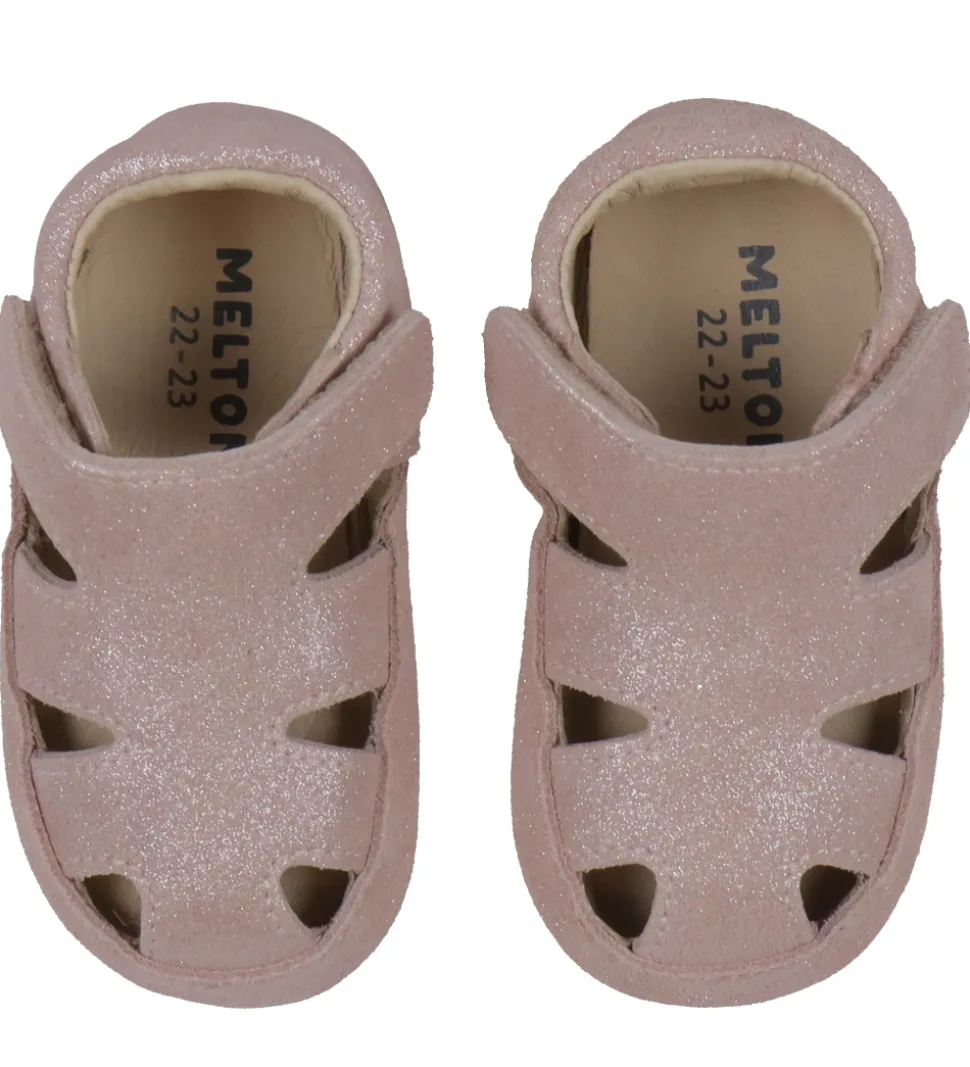 Yndige Melton ballerina hjemmesko i rosa ruskind med sølv glimmer.