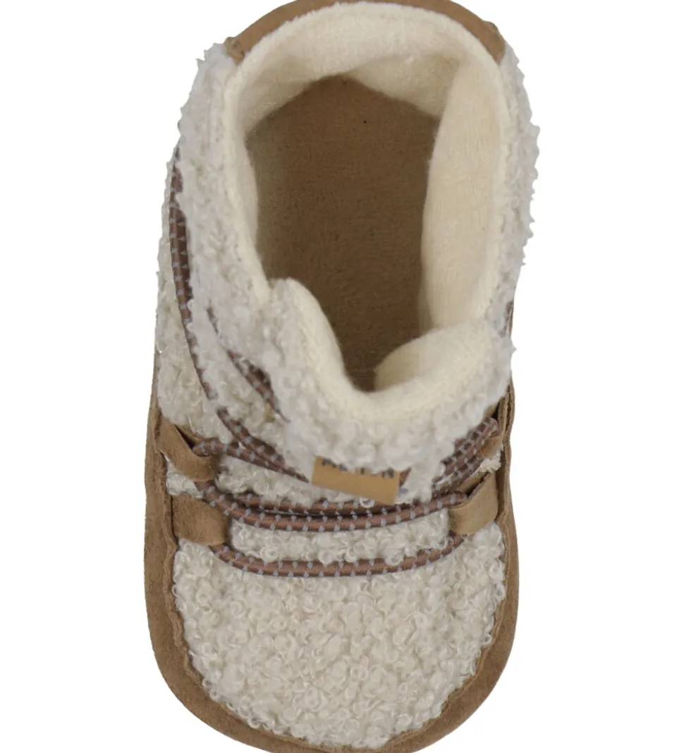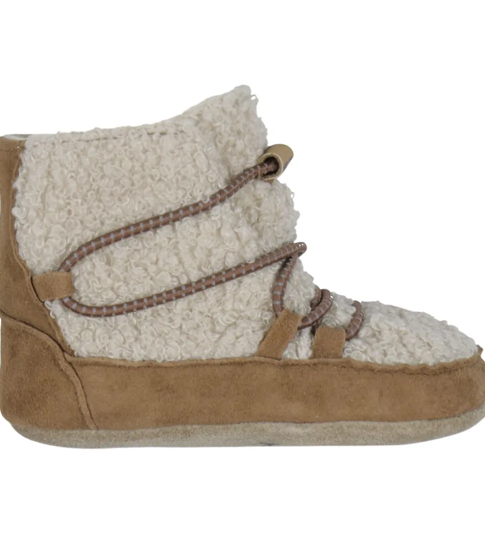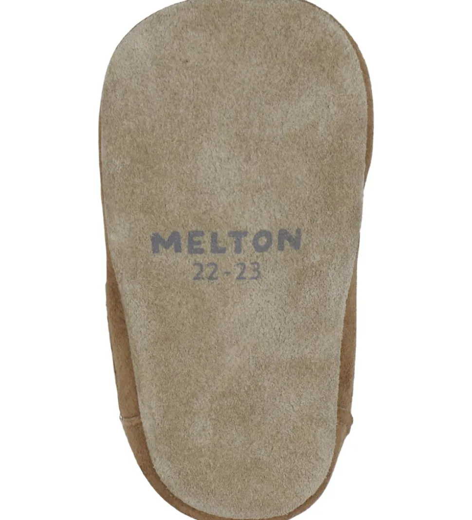 Melton skindfutterne har elastikker over vristen, så det er nemt at få dem af og på. Indvendigt er de forede med blødt bomuld og har en udtagelig indersål. Under bunden er der brunt ruskind, så det er nemmere for barnet at stå fast.