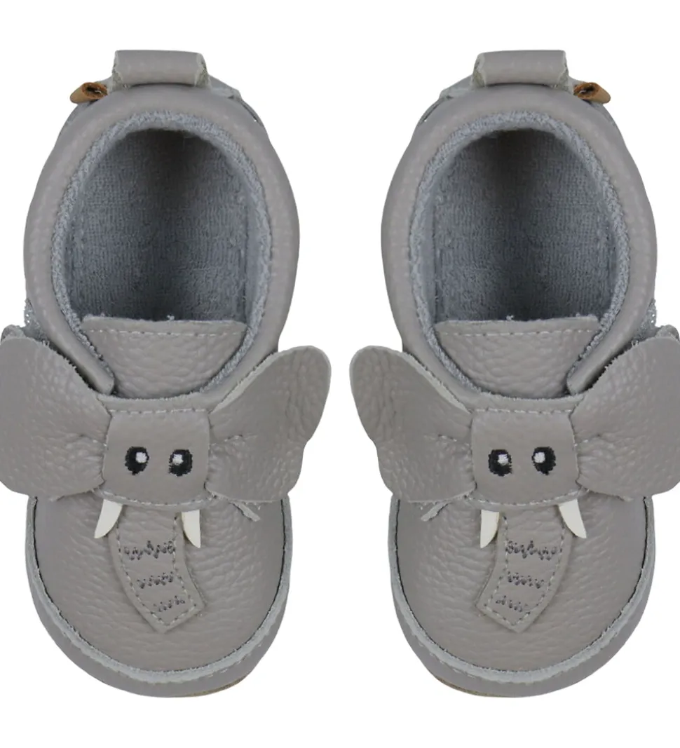 Sjove Melton skindfutter i lysegråt skind og med et sødt elefantdesign på foden.