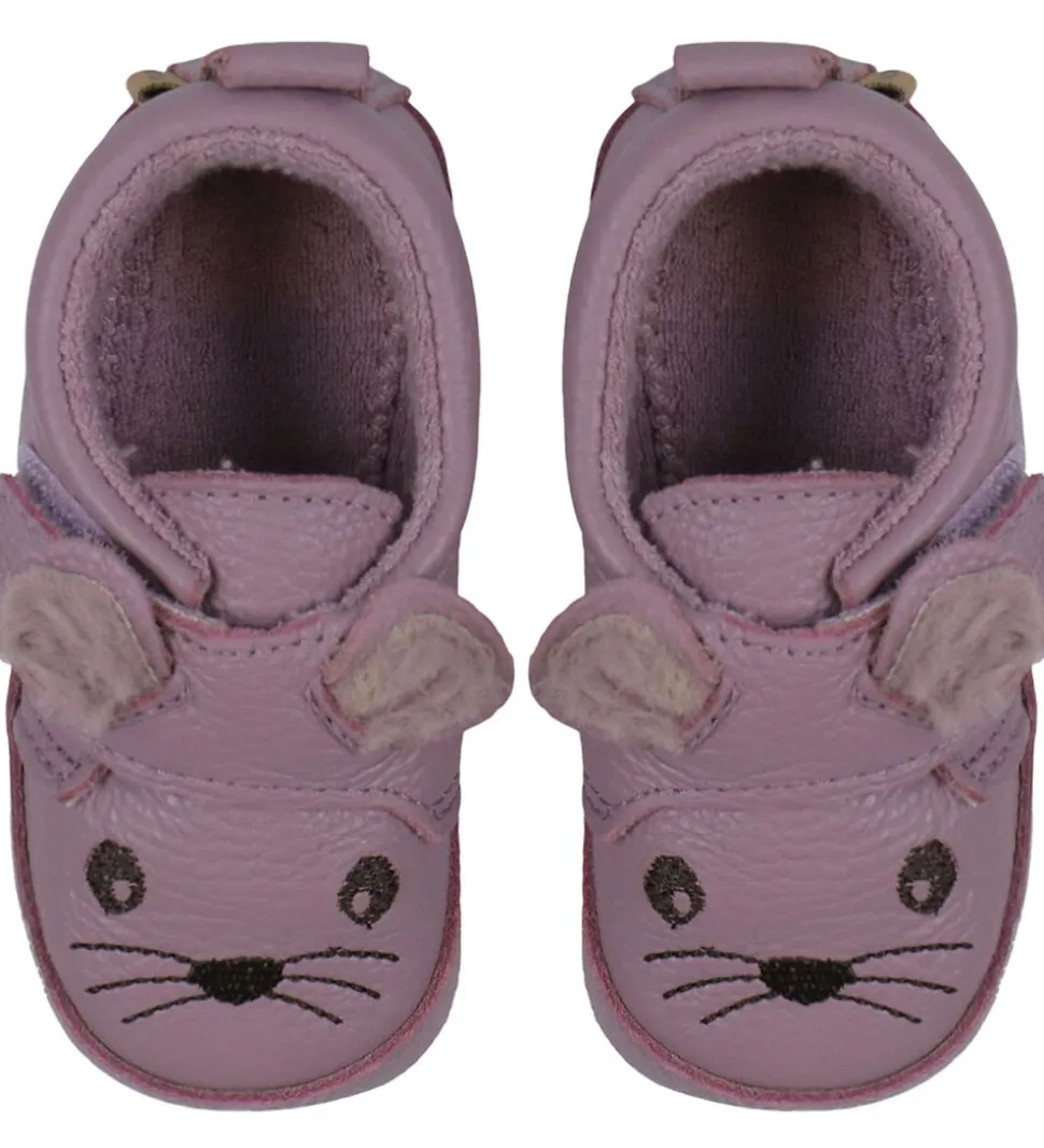 Fine Melton skindfutter i lilla skind og med et sødt musdesign på foden.