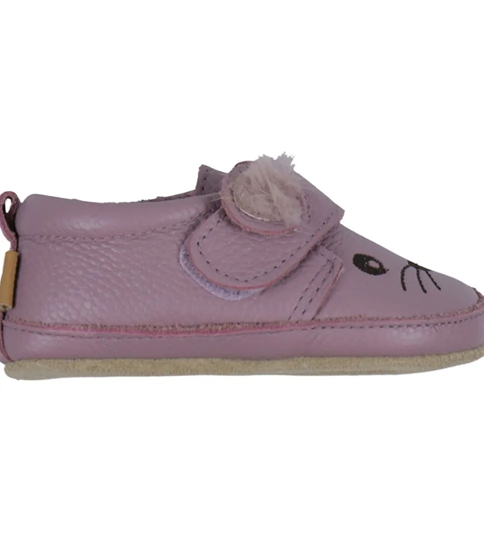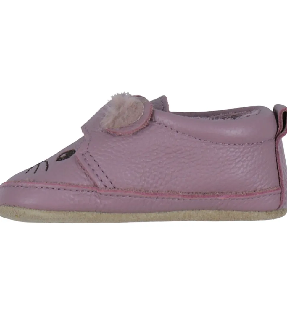 Melton skindfutterne har hælstrop og en bred velcrolukning over vristen, så det er nemt at få dem af og på. Indvendigt er de forede med blødt fleece og har en udtagelig indersål. Under bunden er der brunt ruskind, så det er nemmere for barnet at stå fast.