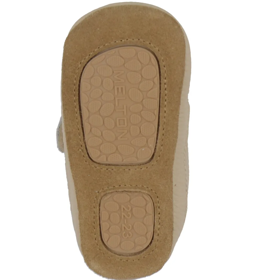 Melton skindfutterne lukkes over vrsiten med velcro. På indersiden er der blødt skind, og de har udtagelige indersåler. Ydersålerne er lavet af ruskind, og de har to gummiindsatser, som sikrer et godt fodfæste.