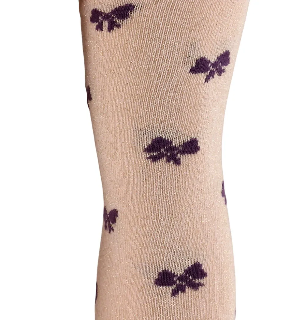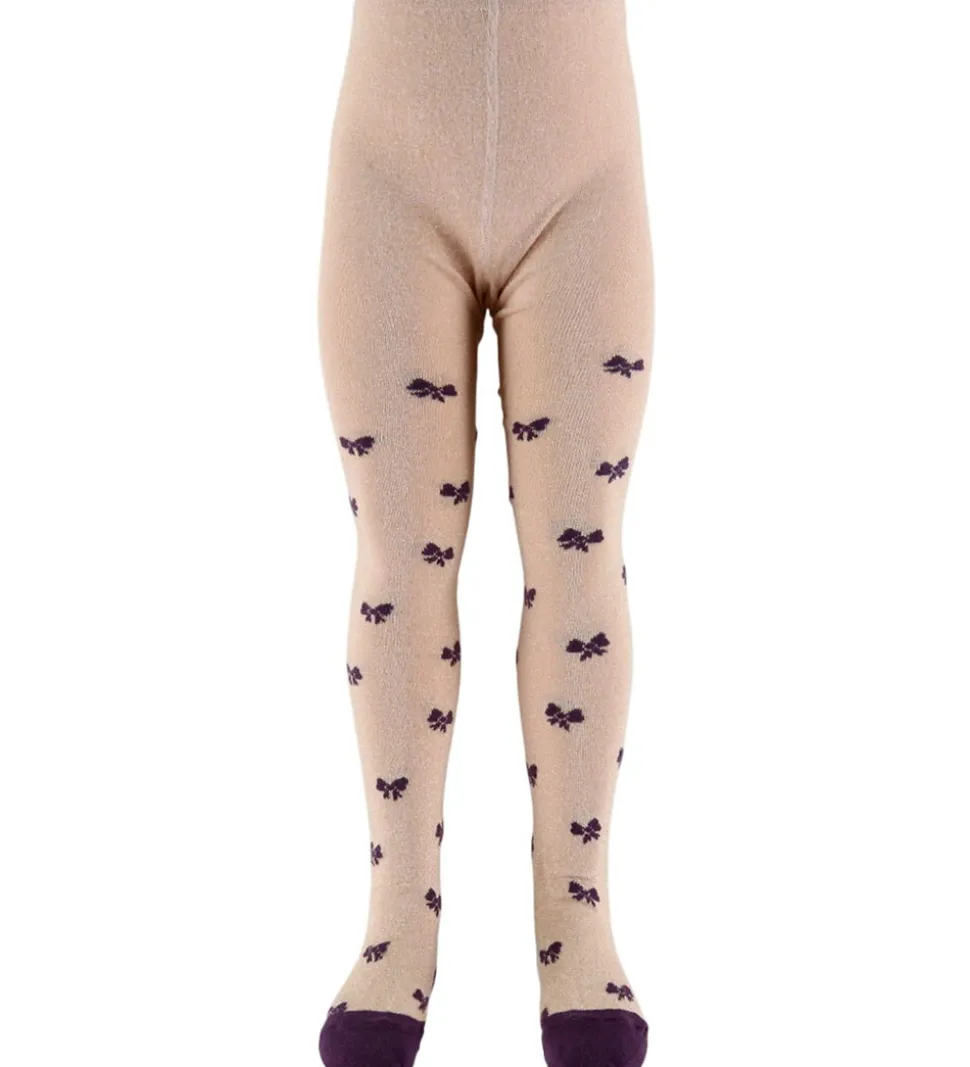 Attraktive Melton strømpebukser i rosa med glimmer og lilla sløjfer. Strømpebukserne har en elastisk talje for en god pasform.