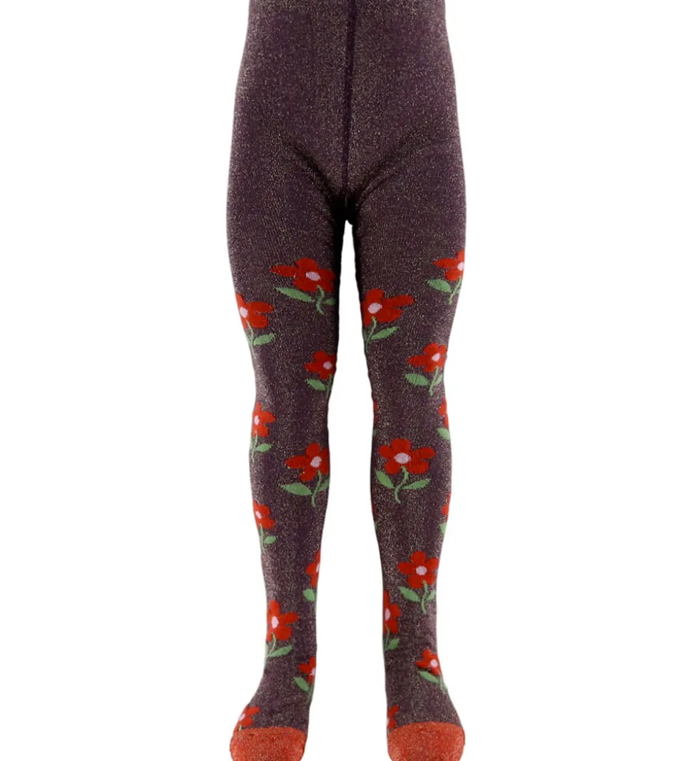 Elegante Melton strømpebukser i lilla med glimmer og med et blomstermotiv i rød og grøn. Strømpebukserne har en elastik i taljen, som sørger for god pasform. Melton strømpebukserne kombinerer stil og funktionalitet.