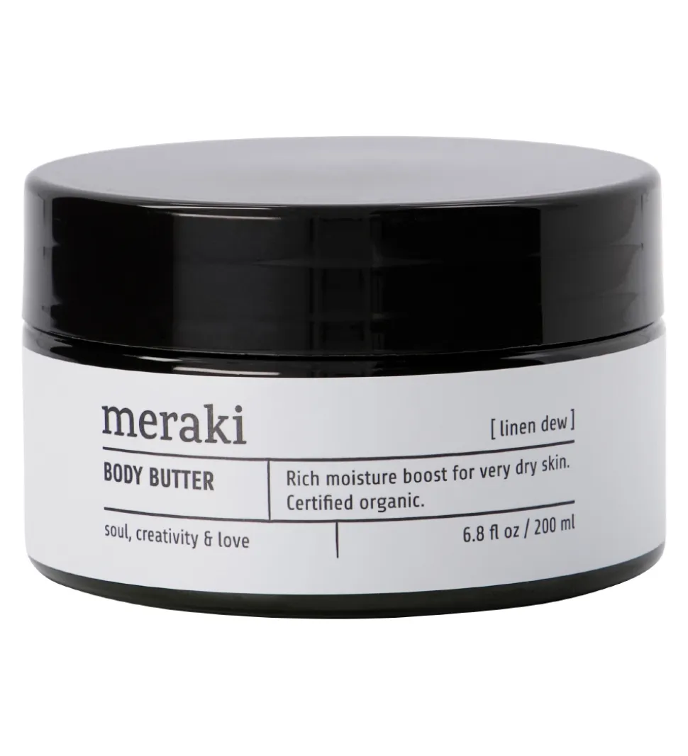 Meraki cremen er god til meget tør hud, og den efterlader ikke huden fedtet. Aloe vera, sheasmør og et væld af nærende olier fra mandel, solsikke og oliven heler tør hud og tilføjer fugt. Denne creme har duften Linen Dew med undertoner af pebermynte og patchouli.