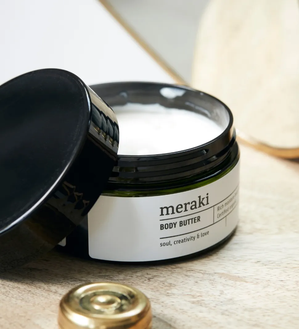 Lækker Meraki body butter i en mørkebrun beholder med et praktisk, sort skruelåg.