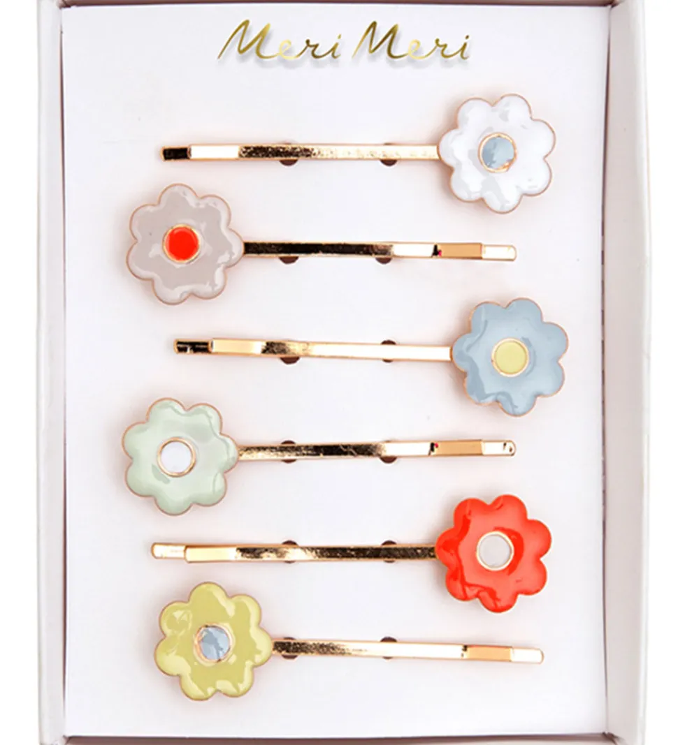 Farverigt Meri Meri hårnåle med små blomster i forskellige nuancer, herunder rød, grøn og blå, der tilføjer en legende detalje til håret. Hårnålene er ideelle til at fuldende ethvert outfit.