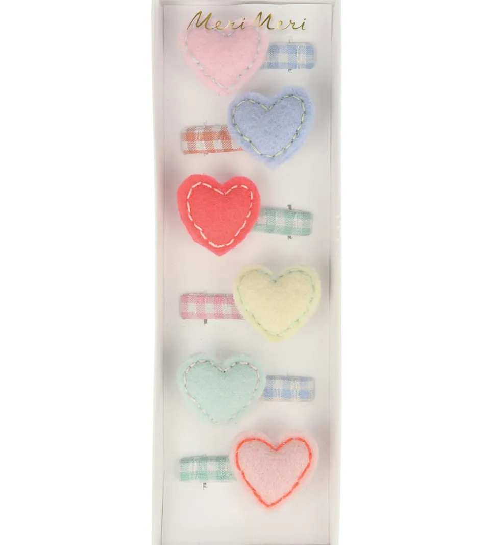 Farverigt Meri Meri sæt med 6 hårspænder med søde hjerteapplikationer i lyse nuancer som pink, mintgrøn og lavendel. Hårspænderne er perfekt til at pifte enhver frisure op med et legende touch.
