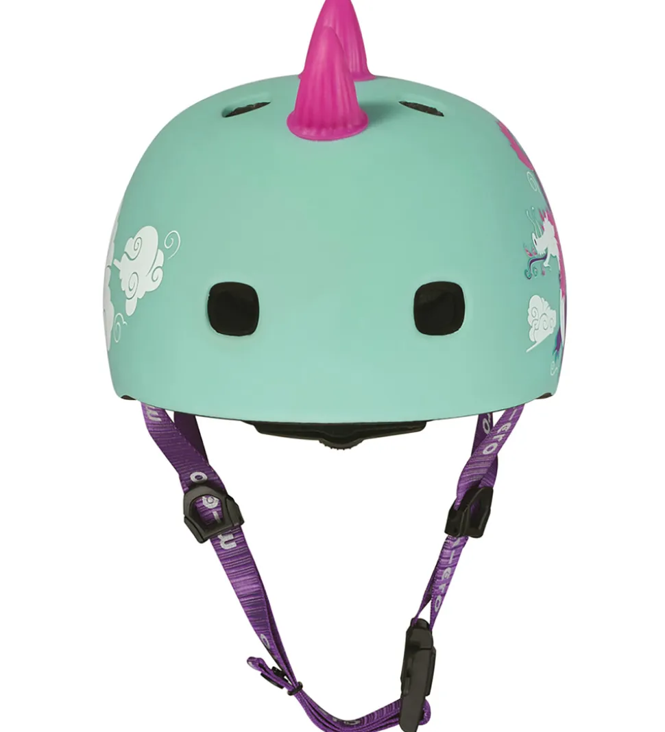 Sej Micro hjelm i turkisblå med print af en drage i hvid, pink og lilla på den ene side og hvide skyer på den anden side. På toppen af hjelmen er der tre drage-takker i pink.