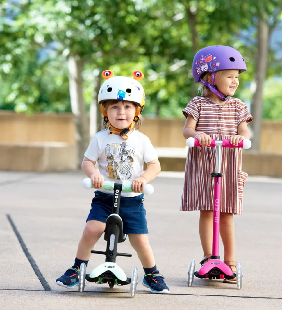 Micro løbehjulet har en praktisk multifunktion, da den også kan bruges som en løbecykel og bruges fra 12 måneders alderen og indtil 6 års alderen. Den kan bruges med sæde med mulighed for fodstøtte og skubbestang til forældrene, uden skubbestang og som et almindelig løbehjul.