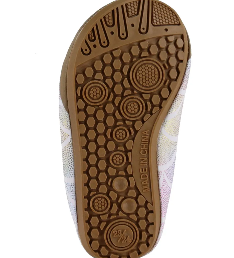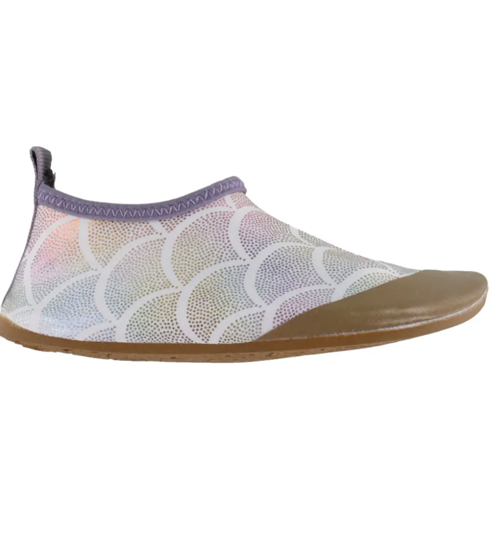 Flotte Mikk-Line badesko i hvid med et fint mønster i metalliske farver og med detaljer i lilla og brun.