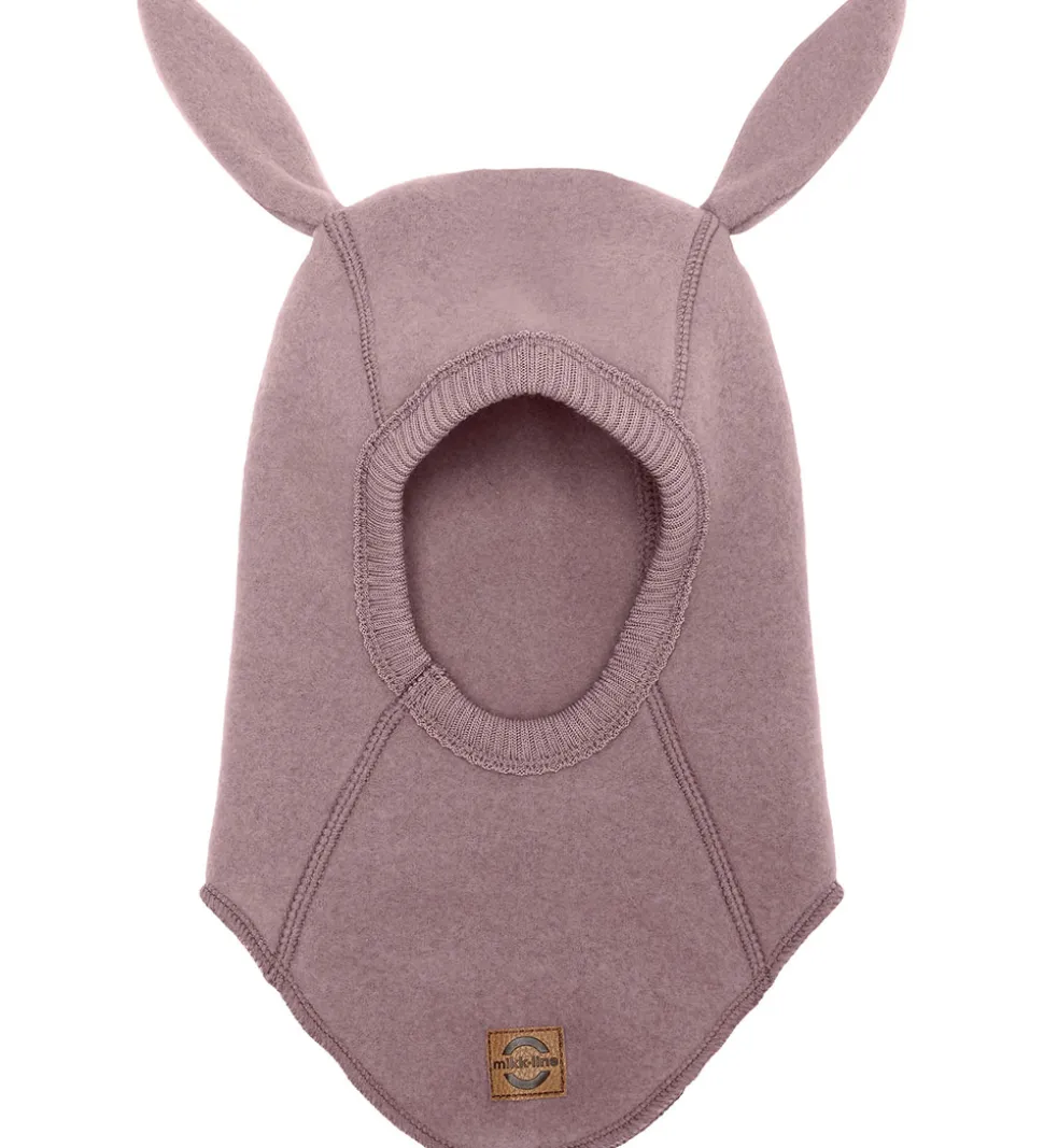 Fin Mikk-Line elefanthue af filtet merinould i mørk, støvet lilla. Elefanthuen har nuttede kaninører på toppen, og under hagen er der et brunt lædermærke med et Mikk-Line-logo.