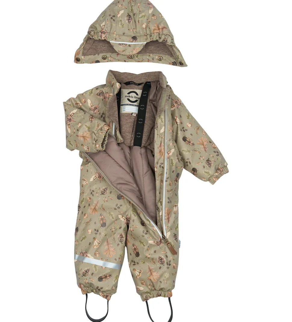 Flyverdragten er vatteret, og indvendigt er den foret med blødt, meleret brunt fleece i hætte og ved overkroppen, men der er glatvævet for i resten af flyverdragten.