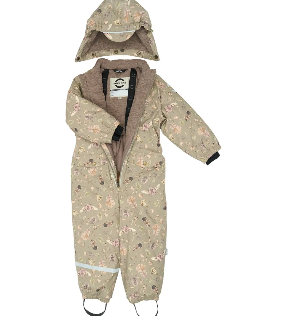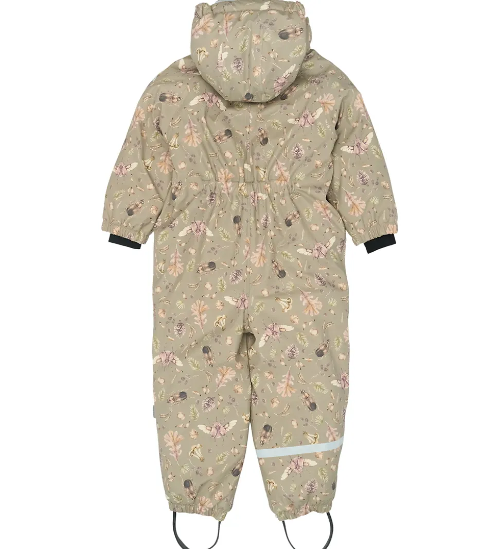 Fin Mikk-Line flyverdragt i støvet grønt PU med et efterårsprint med blade, kogler, agern og biller i brune og grønne nuancer.