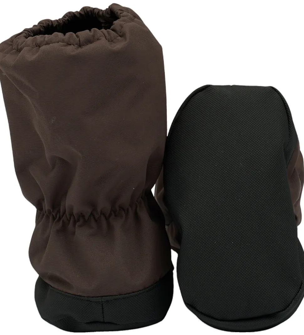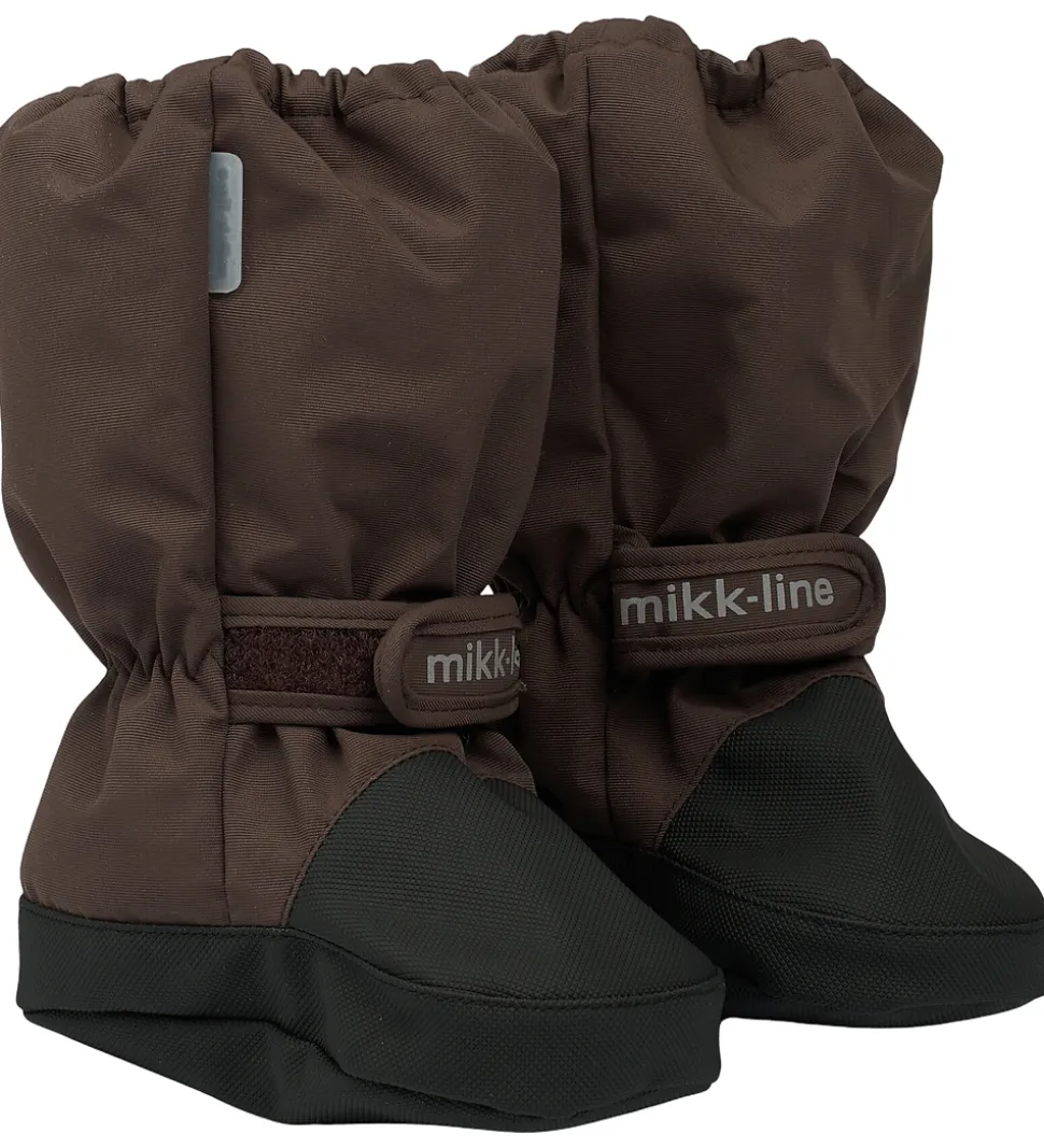 Praktiske Mikk-Line overtrækssko i en dyb brun med justerbar strop og logo. Mikk-Line overtræksskoene har en elastisk åbning, der sikrer en behagelig pasform og beskytter mod elementerne. På undersiden af fødderne og på snuderne er der sorte forstærkninger. På indersiden er der blødt fleece.