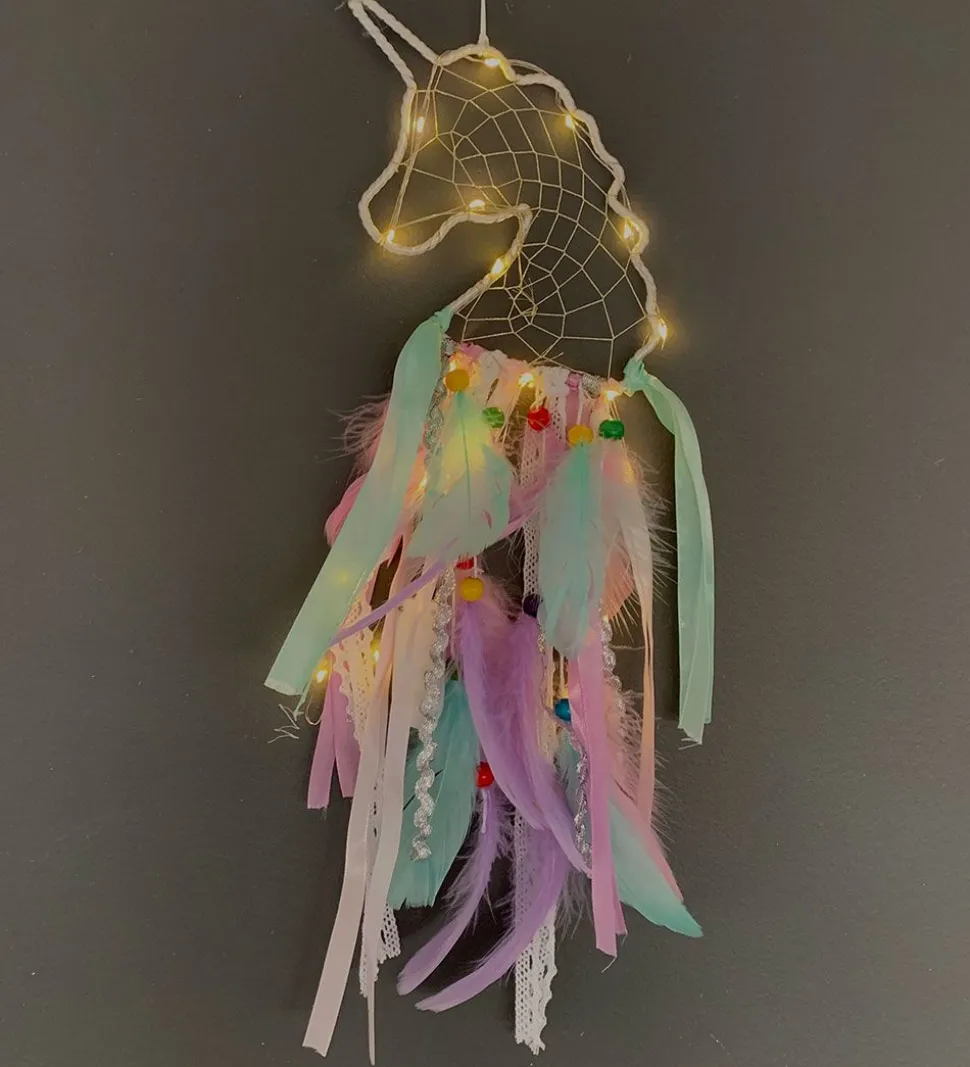 Dekorativ MillaVanilla drømmefanger med form som en enhjørning i sølv, med et hæklet mønster i midten i guld. Ned fra enhjørningen hænger der fjer, perler, bånd i satin og blonder.