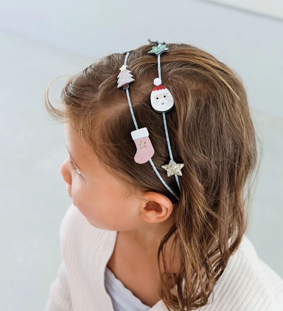 Sød Mimi & Lula hårbøjle i støvgrøn med forskellige jule-applikationer med glimmer-detaljer, heriblandt en julemand og en julestok.