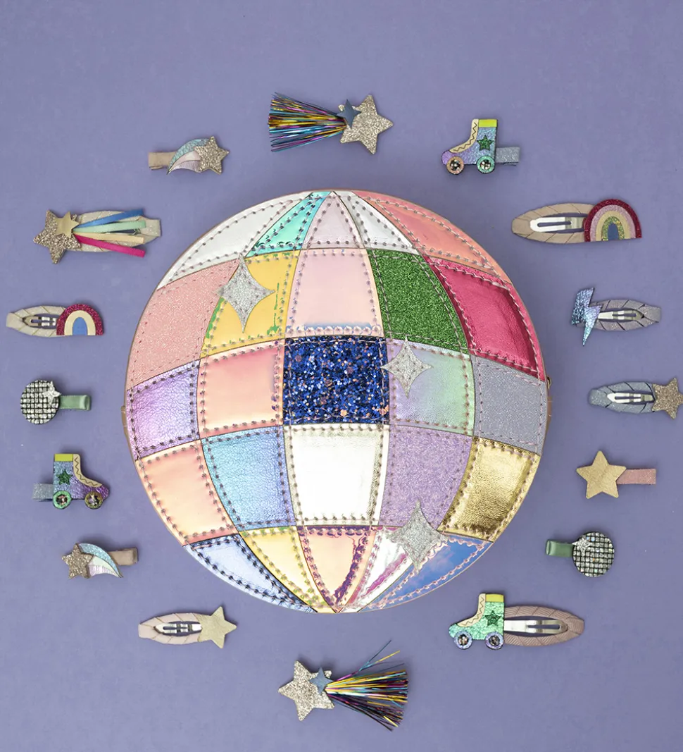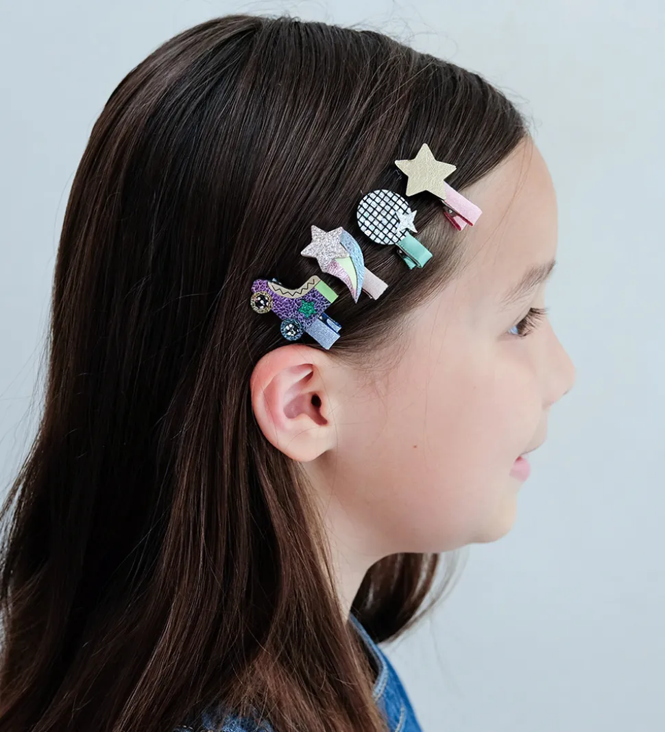 Seje Mimi & Lula hårklips solgt i en 8-pak i et farverigt tema med rulleskøjter, diskokugler, stjerner og stjerneskud som motiver og med glimmer.