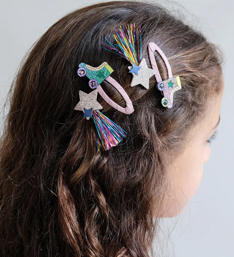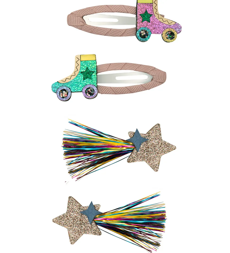 Seje Mimi & Lula hårpynt solgt i et sæt med 2 hårspænder og 2 hårklips i et farverigt tema med rulleskøjter og stjerneskud som motiver og med glimmer.