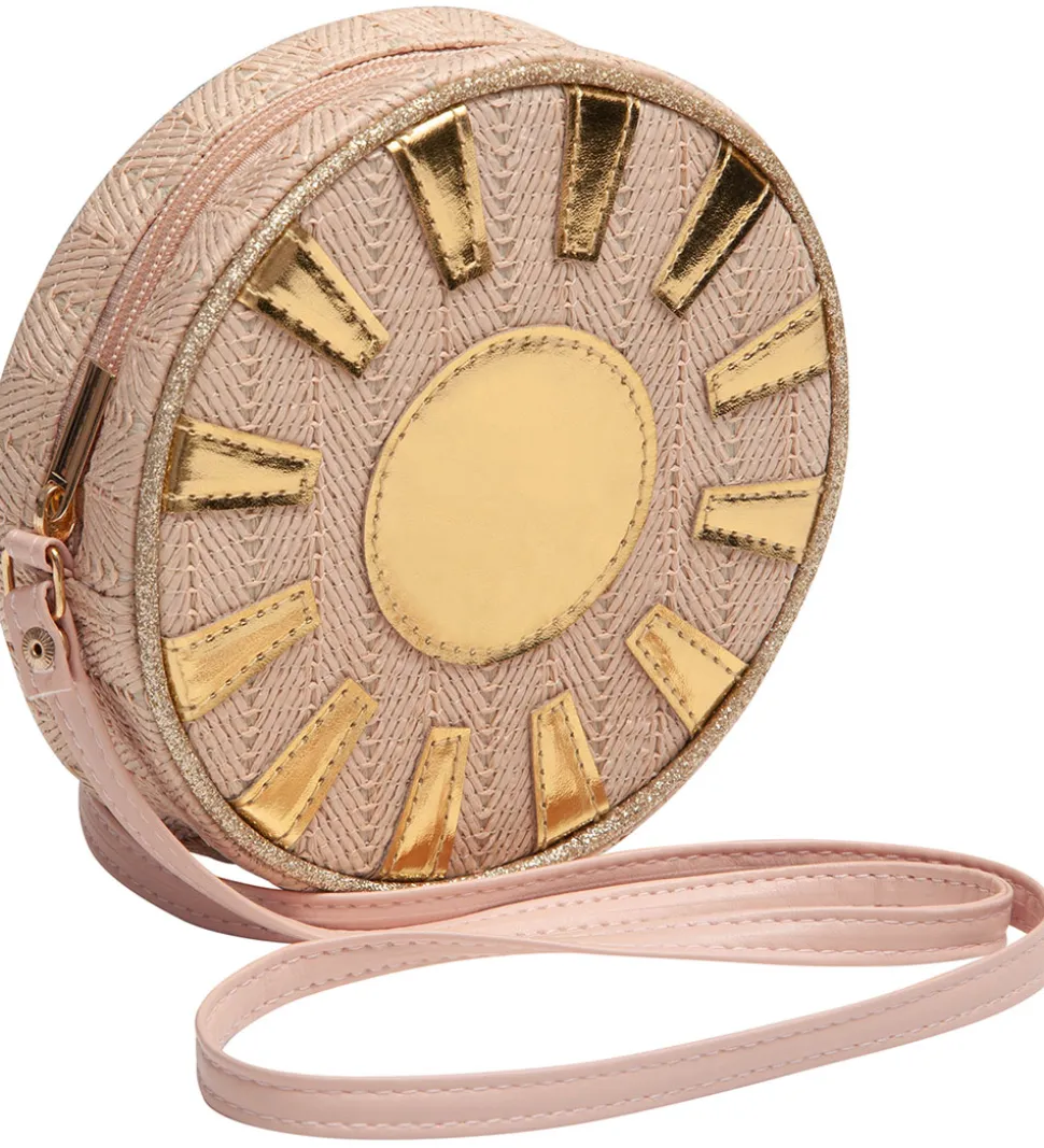 Lækker Mimi & Lula skuldertaske i et lyst, rosa fletdesign med en dekorativt guldsol. Tasken har en praktisk rem, der gør den nem at bære, perfekt til enhver lille eventyrer, og den har ét rum med lynlåsåbning.